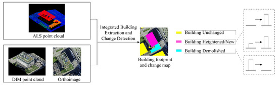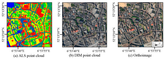 A comparison in the data quality between ALS and airborne photogrammetry was referred to [5,6]. The main product from laser scanning is usually three-dimensional (3D) point clouds. In contrast, airborne photogrammetry produces geo-referenced imagery, point clouds, Digital Surface Models (DSMs) and orthoimages. In photogrammetry, point clouds are generated through dense image matching (DIM) [7,8]. Generally, ALS point clouds are more accurate than DIM point clouds in terms of vertical accuracy. The former usually contains less noise than the latter. However, DIM provides, not only geometric information in point clouds or DSM, but also spectral information in the orthoimage. Previous work suggests that the spectral information from orthoimage is complementary to the geometric information for object extraction or change detection tasks [9,10,11]. That is, even though the accuracy and noise level in DIM data are less satisfying than those of ALS data, the spectral information can fill the gap to some extent.
