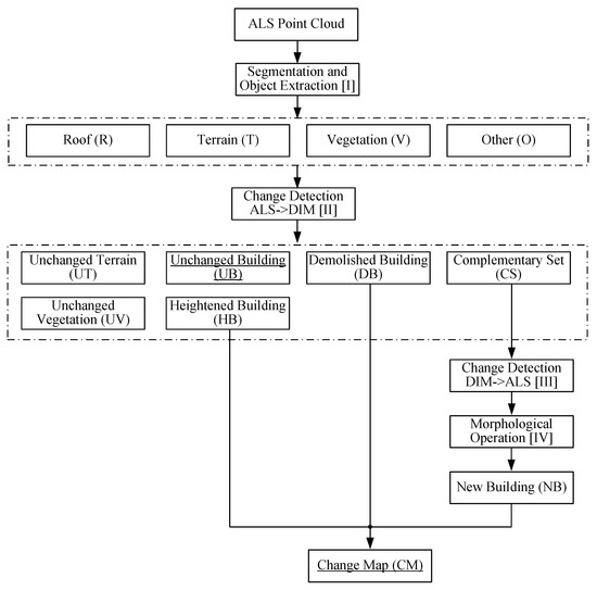 - Step III: In the complementary set, the newly-built buildings () are detected by comparing the DIM data to the ALS data. This step is named “Change detection DIM->ALS” since DIM data are used as referred data.