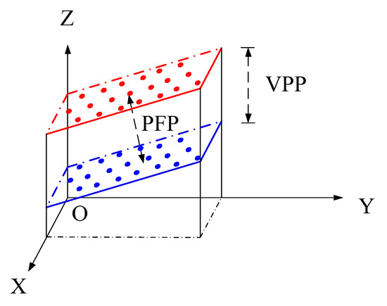 To make the change detection robust to point cloud noise and data gaps, the Vertical Plane-to-Plane Distance (VPP) is proposed as an indicator to measure the change scale between ALS roof segment and its corresponding DIM points. For each point, , on the ALS roof segment, the elevation on the DIM surface at location is calculated. Since the DIM point cloud is relatively noisy, a cube with a side length of is constructed at the center . The average height of all points in this cube is taken as the DIM elevation at . Next, calculate the vertical elevation change for each point on the ALS segment, and take the average as the VPP distance: