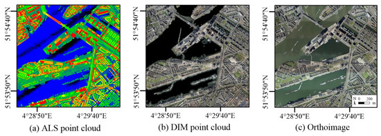 The experiments are implemented on two study areas from The Netherlands. The specifications of the study areas are shown in Table 1. The first study area is located in Rotterdam, which is a densely-built port city mainly covered by residential buildings, skyscrapers, vegetation, roads, and waters. The second study area is located in Enschede, which is also a densely-built urban area. Dense image matching in the two study areas are both performed in Pix4Dmapper [49] to obtain point clouds and orthoimage. The ALS point clouds, DIM point clouds and orthoimages for Rotterdam data and Enschede data are visualized in Figure 5 and Figure 6, respectively.