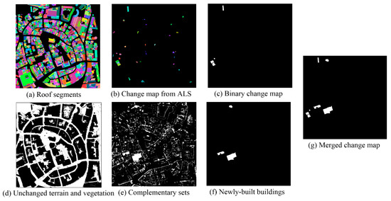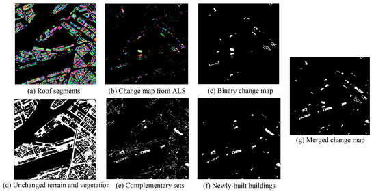 Qualitative results: The intermediate results of Enschede data are shown in Figure 11. Surface-based segmentation is performed on the ALS data to generate 1866 segments. After segment screening, 128 valid roof segments are shown in Figure 11a. Some roofs are represented by a complete segment, while some roofs are broken into several sub-segments. Segments with height change larger than 3 m are considered as changed buildings as shown in Figure 11b. The binary change masks after morphological processing are shown in Figure 11c. Figure 11d shows the union of unchanged terrain (UT) and unchanged vegetation (UV). When the ALS roof regions are excluded, the complementary set (CS) is obtained as shown in Figure 11e, where newly-built buildings show strong response. Morphological operation is applied to extract new buildings as shown in Figure 7f. Finally, the bidirectional change detection masks are merged into the complete change map as shown in Figure 7g.