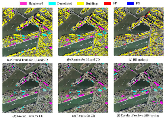 The final results are shown in Figure 12. For the definition of each sub-figure and color coding, the readers are referred to Figure 8. Figure 12c shows that the proposed method can successfully extract most building footprints for the Enschede data. A few FPs and FNs lie along the building boundaries or inside the narrow courtyard. Considering change detection, the ALS data and DIM were acquired with an interval of four years, and only four changes are heightened and three buildings are demolished. However, Figure 12b,e still demonstrate that the proposed method is effective in change detection and robust to data noise. In contrast, Figure 12f shows that surface differencing brings more FPs than our method.