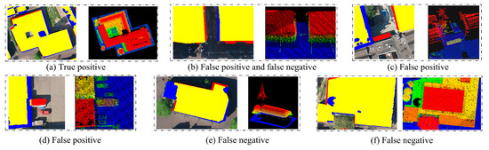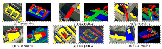 Concerning the errors in the change maps as shown in Figure 8e and Figure 12e, FPs often appear on the containers, trucks, vegetation, etc. These objects are often mistaken as buildings in building extraction and thus the errors remain in the final change map. FNs often appear when the roofs are small or broken. When large data gaps exist on the changed buildings in the ALS point clouds, FNs may also occur in the change map (e.g., Figure 13f). In shaded regions, such as a narrow road or narrow courtyard, dense matching may fail with no point cloud or generate inaccurate points whose heights are higher than true values. Therefore, both FPs and FNs may appear on the shaded regions. If a FN happens, our results show that this FN can be a heightened building or a lowered building, depending on whether dense matching failed or is inaccurate.