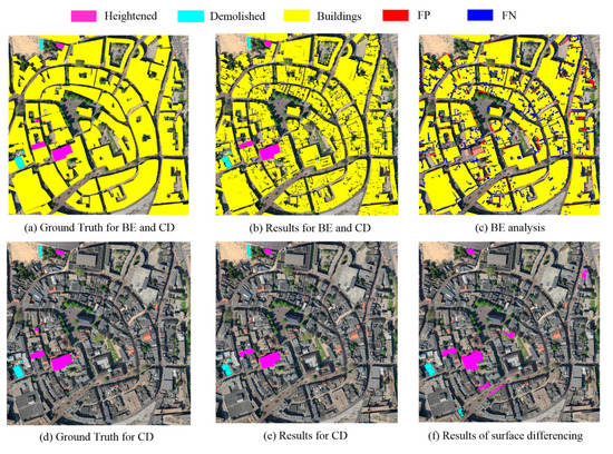 Considering the results of surface differencing in Table 3, the recall of heightened buildings are much higher than that of demolished buildings. Figure 8f shows that surface differencing brings many FPs in vegetation and shadow, where DIM point clouds are noisier and higher than ALS data due to dense matching errors or natural growth. Then, surface differencing tends to over-classify these possible regions as heightened buildings. The precisions of heightened and demolished buildings are lower than 61.41% and 53.00%, which are much lower than the proposed method.