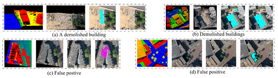 Four examples of change detection results are shown in Figure 10. Each example from the left to the right shows the ALS point cloud, DIM point cloud, result from our method and result from surface differencing. Figure 10a shows a demolished building-group. Our method detects the change with sharp boundaries while surface differencing takes the neighboring vegetation changes as building changes and also omits one building change. Figure 10b shows that both our method and surface differencing can detect an independent demolished building. Figure 10c shows a building that is partly heightened and partly demolished. Our method can detect the complicated changes correctly, while surface differencing omits the demolished building. The area of demolished building is rather small, and thus, eliminated in surface differencing. Figure 10d shows both methods bring FPs in a courtyard. In this shaded region, DIM point cloud is noisy and its height is usually deviated from the true height, so FPs are more likely to appear.