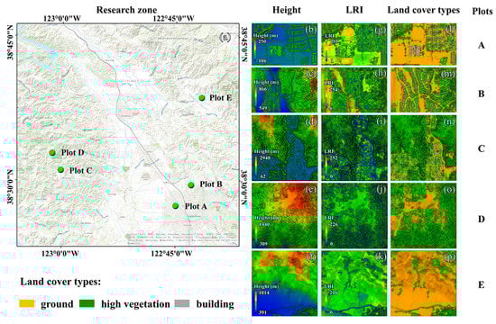 The study sites were located in Sonoma County, where is in northwestern California, the USA (Figure 1). We selected five plots, including three urban plots and two mountainous plots on the slope. There are multiple land cover types in each plot to validate the tested LRI correction methods. The statistical information of each plot is shown in Table 1. Two urban plots (Plot A and B) are in Santa Rosa (122°44′41″ W, 38°27′23″ N), where is the county seat of Sonoma County. The other urban plot (Plot C) and a mountainous plot (Plot D) that has large-scale forests are near the Armstrong Redwoods State Natural Reserve. The dominant tree species are Coast redwood (Sequoia sempervirens), Douglas fir (Pseudotsuga menziesii), Coast live oak (Quercus agrifolia), and Blue oak (Quercus douglasii) [29]. Each urban plot mainly contains five land cover types, including road, building, grass, forest, and bare land. Plot E is close to bare land with a mean slope of about 16°.