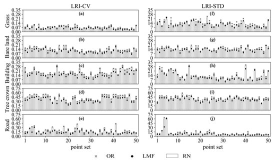 As shown in Figure 4, over 94% of point sets have lower LRI-CV and LRI-STD after the LMF correction than those of the original LRI information. Although over 72% of the RN-corrected point sets from five land cover types had lower LRI-CV, the LRI-STD of more than 70% of point sets witnessed increasing, which means the similarity of pointwise LRI values became lower after the RN correction. For a point set, using the LMF correction method could more robustly increase the similarity of LRI values (with decreasing LRI-CV and LRI-STD) compared to using the RN method.