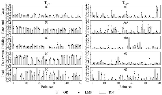 As shown in Figure 6 and Table 4, over 82% of the point sets have lower TCV values after the LMF correction compared to those of the original and RN-corrected LRI. In the LMF-corrected results, the mean TCV decrease by nearly 0.03 for point sets from road and building, by 0.07 for point sets from tree crowns, and by 0.01 for point sets from bare land. However, the mean TCV of each point set from grass is nearly invariable after the LMF correction. In addition, the most significant declines of TCV are 0.16 for point sets from road, 0.12 for point sets from tree crown, 0.08 for point sets from buildings, 0.04 for point sets from bare land, and 0.025 for point sets from grass after the LMF correction than using the original LRI information (shown in Figure 6a–e). It should be noted that the TCV of each point set was almost unchanged after the RN correction. We found that the average TCJV only decreased for point sets from bare land in the RN-correction results, but all types of point sets in the LMF-corrected results. As shown in Figure 6, the TCJVs become lower for over 78% of the tested point sets when using the LMF method compared to those of the original and RN-corrected LRI. The average TCJVs of LMF-corrected results drop dramatically for point sets from bare land (by from 1.19 to 0.62). Still, they vary slightly for those from tree crowns due to the high similarity (the average TCJV = 0.07) of the original LRI information collected at different timestamps. For over 78% of the point sets collected within multiple timestamps, the similarity of pointwise LRI values was higher after the LMF correction than those corrected by the RN method.
