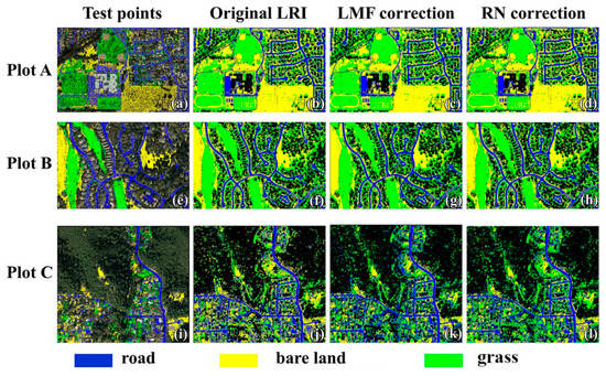 Classification results of three land cover types. All test points are shown in subfigures (a,e,i). The subfigures (b–d), (f–h), and (j–l) show the classification results of using the original, LMF-corrected, and RN-corrected LRI information, respectively.