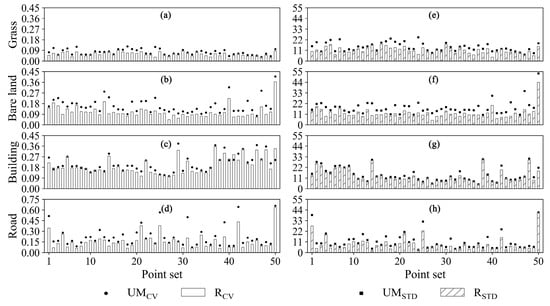 We calculated the mean STD and CV of the original pointwise LRI information collected at the same timestamp but with different R values (RSTD and RCV) or with similar R values but changeable UM (UMSTD and UMCV) in each point set from four land cover types. The points with a difference in R-values less than 0.1 m were assumed as points collected with similar R. We used the average values of these four metrics to do the sensitivity analysis, as each point set might contain multiple UMSTD, UMCV, RSTD, and RCV values. The results are shown in Figure 8 and Table 6, in which the RSTDs and RCVs of point sets collected at only one timestamp were calculated. In addition, we removed the point sets from tree crowns where the local points rarely had similar R during the sensitivity analysis.