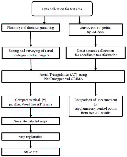 In this study, the feasibility of a boundary verification survey using UAV aerial photogrammetry in a digitalized urban cadastral area of Taiwan was investigated. A high-quality-medium format camera, with a 55 mm focal length, was carried on a rotary UAV to record 3 cm GSD (ground sampling distance) images, flying at an altitude of 300 m. The images were taken with an 80% end-lap and side-lap to increase the visibility of more terrain details for stereo-mapping. While the AT results from the Pix4Dmapper and ORIMA software were almost the same, the y parallax from the AT result achieved using the ORIMA software was lower than that achieved using Pix4Dmapper. Therefore, the detailed map was produced by the AT achieved using ORIMA. According to the test conducted in this study, UAV aerial photogrammetry can generate many more land detail points globally, i.e., more detailed maps, and orthoimages for map registration, ensuring that the resulting digitalized cadastral maps are much more consistent with the collected possible parcel points after map registration. In the map registration stage, after determining 11 partitions for map registration in order to absorb errors using affine transformation, the distance differences were reduced by 2-9 centimeters in different partitions after map registration. After this, the coordinates of the parcel points for the verification survey were obtained after map registration. Additionally, UAV aerial photogrammetry provided the coordinates of the supplementary control points using the AT result from ORIMA. Then, all the resampled undistorted images based on the computed camera parameters, including the exterior parameters and pixel size, were imported into the Pix4Dmapper software to measure the coordinates of the supplementary control points by space intersection using multiple bundles (see Figure 5). Finally, the distance and angle between the parcel points of the verification and supplementary control points were calculated for the boundary verification survey by the radiation method using a total station. Even the building corners were used as controls for the boundary verification survey by the free station method, using a total station to complete the boundary verification survey process. The results all met the standards required by the Regulations for the Implementation of a Cadastral Survey, art. 75 and art. 76, in Taiwan. This proved the feasibility of a boundary verification survey using UAV aerial photogrammetry in digitalized urban cadastral areas. Simultaneously, the proposed approach was able to generate one cadastral map that was consistent with the actual terrain details, meaning that while boundary verification surveys are necessary, surveyors do not need to locally survey the terrain represented in the detailed map. Therefore, the proposed approach can reduce labor costs and improve the efficiency of future boundary verification surveys.