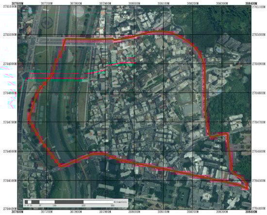 This study focuses on the use of UAV aerial photogrammetry in boundary verification surveys of urban digitalized cadastral areas in Taiwan. The results should comply with the accuracy requirements, as specified in Articles 75 and 76 of the “Regulations for the Implementation of Cadastral Surveys” in Taiwan, and overcome the difficulties associated with conducting detailed surveys of Taiwan’s urban areas. A flowchart of the study is illustrated in Figure 1. The test area, shown in the red polygon in Figure 2, was in the 4th subsection, ChengDa section, Wensang District, Taipei City, Taiwan. Firstly, data related to the test area should be collected, including the announced coordinates of the control points in the cadastral coordinate system surveyed using a ground survey by the Land Administration Bureau, Taipei City Government in Taiwan, the land detailed points surveyed by total stations, and digitized cadastral maps. The planning and execution of UAV aerial photogrammetry is described in Section 2.1, including the planning and dronestagramming, setting and surveying of the aerial photogrammetric targets, aerial triangulation, coordinate measurements of supplementary control points, and detailed map generation by UAV aerial photogrammetric stereo-mapping. The boundary verification surveys in digitalized cadastral areas in Taiwan are described in Section 2.2, including map registration and boundary verification surveys.