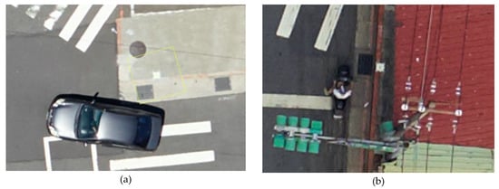 The principle of stereo mapping is derived from the principles of field surveying in subsection 807 of the Resurvey Handbooks of Cadastral Maps by the Digital Method in Taiwan. Moreover, based on the characteristics of digitalized graphic urban cadastral maps in Taiwan, urban terrain details were stereo-mapped to identify possible parcel points on the parcel boundaries, for example, (1) road boundaries (Figure 6a); (2) the centerline of a wall on the top of a building of the same style, except for the wall on the outermost boundary of the top of the building; (3) the outer edge of a wall on the outermost boundary of the top of a building of the same style (red lines in Figure 6c), and the outer edge of a wall of a single building (red lines in Figure 6b), except the wall attached to exposed steel reinforcing; (4) roof eaves (green lines in Figure 6c); (5) an embankment within the scope of a waterway and bounded by the lower foot of its embankment; and (6) the location of changes of vegetation covers and topographical change boundaries.