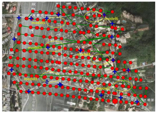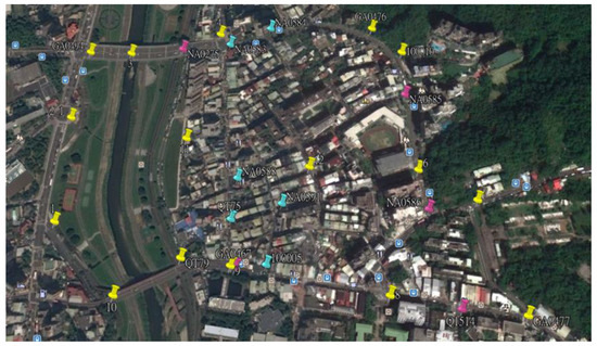 Using the principles of control point selection described in Section 2.1.2, Figure 10 demonstrates 16 control points (red and blue marks) and 5 checkpoints (yellow marks), where the red marks are the 5 announced control points that are also used for the subsequent least squares collocation in the next step to confirm the consistency of the coordinate reference system between the cadastral map system and e-GNSS coordinate system. The relationship between all control points and dronestagramming locations is shown in Figure 9.