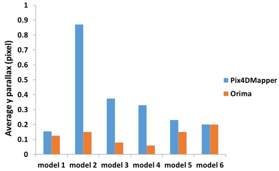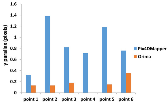 This subsection presents the detailed map results achieved using stereo-mapping. As mentioned in Section 2.1.5, two AT results were obtained, and one was chosen for detailed map generation by stereo-mapping. Six well-distributed models (see the yellow ovals in Figure 9) were selected for a comparison of the y parallax in these two AT results, and there were six evenly distributed checkpoints in each model. The result is shown below in Figure 12, in which the average y parallax values are all less than 1 pixel in the six models from the two AT results, and the ORIMA AT result had a smaller y parallax value to that achieved by Pix4Dmapper. The average y parallax of all points in the six models was 0.36 pixels using the AT results from Pix4Dmapper and 0.13 pixels using the AT results from ORIMA. All the y parallax values in model 1, 3, 4, 5, 6 in six locations of each model were less than 1 pixel, except for model 2. A y parallax value larger than 1 pixel will cause discomfort while stereo-mapping. Figure 13 shows a comparison of the y parallax for six locations in model 2, and the y parallax is larger than 1 pixel at points 2 and 5. This means that stereo-mapping using the Pix4Dmapper AT result may cause discomfort. The reason is that while the AT for the Pix4Dmapper was fully automatic, some incorrect tie points were not completely removed. Based on the above analysis, this study used the AT result of ORIMA to generate the detailed map manually, and the orthoimage automatically by Pix4Dmapper. The results are shown in Figure 14. Meanwhile, the coordinate measurement of the supplementary control points for the boundary verification survey also used the ORIMA AT results. According to the computed camera parameters, the undistorted images were resampled from the original images. These undistorted images, including the exterior parameters and pixel size, were imported into Pix4Dmapper to measure the coordinates of the supplementary control points by space intersection using multiple bundles of the tool, as shown in Figure 5.