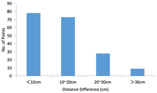 A comparison of the detailed map surveyed by ground surveying and UAV aerial photogrammetry is shown in Figure 15a. Local enlargement is demonstrated in Figure 15b. The red lines define the detailed map stereo-mapped by UAV aerial photogrammetry, and the orange points are the points of the detailed map surveyed by a total station. It is clear that the detailed map stereo-mapped by UAV aerial photogrammetry includes much more detailed data than the details obtained by a total station, which could only collect data near roads. As shown in Figure 15b, there is no difference between the two kinds of data by visual verification. Quantity verification was conducted using the vertical distances from the points surveyed by a total station to the lines of the detailed map stereo-mapped by UAV aerial photogrammetry. The result is demonstrated in Figure 16. For the comparison, 187 detail points were surveyed. There were 77 points at a distance of less than 10 cm, 73 points between 10 and 20 cm, and 28 points between 20 to 30 cm, while only 9 points were over 30 cm apart. Most of the distance differences were less than 20 cm. This shows that the detailed map data using UAV aerial photogrammetry are suitable for the map registration of digitalized graphic maps with a 1/500 map scale. The difference between the two kinds of data was due to the identification of possible parcel points. The ground survey identified them on the ground, while UAV photogrammetry identified them from the stereo model, which is effectively from the sky. Even the identification was quite different; 77 points at a distance of less than 10 cm meant that the ground survey and UAV aerial photogrammetry were consistent.