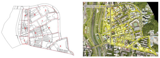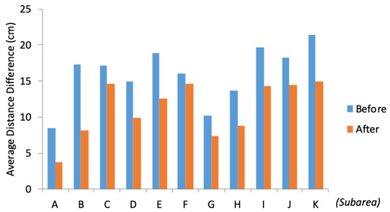 Before the boundary verification survey, map registration must be performed, as described in Section 2.2.1, in order to identify the coordinates of the parcel points for boundary verification. Based on the street layout, 11 subareas, as shown in the left of Figure 17, were partitioned. Figure 18 shows that the average distance difference in most areas is more than 15 cm, with the exception of areas A, G, and H, before map registration. After map registration with affine transformation in each subarea, the average distance difference in each area is reduced by 2 to 9 cm, and all values were less than 15 cm (see the red bars in Figure 18). After each subarea was transformed using affine transformation, and all subareas were merged into one cadastral map (see the right of Figure 17), which was the final version of the boundary verification survey.