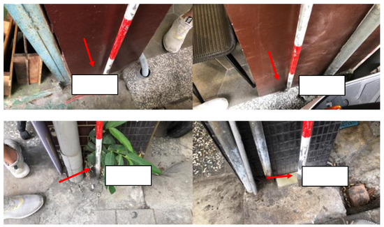 The parcel points after a boundary verification survey using road corners as controls, staked out by the free station method, are shown in Figure 20. The locations after the verification staking survey were located at the centers of walls, indicated by the red arrows, and are consistent with the cadastral reconnaissance data. This demonstrated the feasibility of a boundary verification survey using a detailed map and orthoimage generated by UAV aerial photogrammetry in digitalized urban cadastral areas.