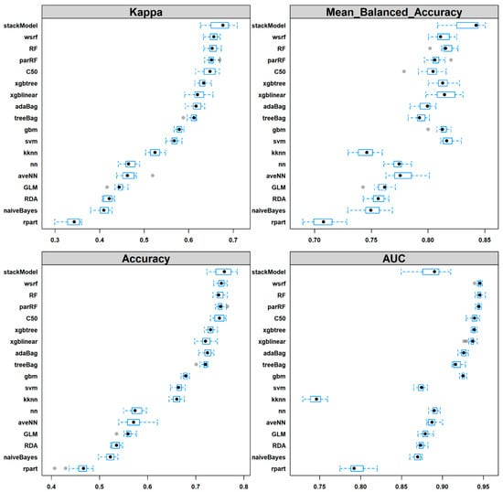 Training performance of the 18 machine learning models for wetland classification. Black dots are the mean value; box shows the 1st and 3rd quartiles; the dashed whiskers are the maximum and minimum values; grey dots are outliers based on the repeated-CV resampling. If there is no overlap of the quantile box, the difference is statically significant. See Table 1 for classifier description.