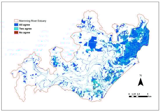 The locations where the three algorithms agree and disagree are shown in Figure 4. In most of the locations (70% of the grids), all three classifiers agree in class allocation. There are also many locations (27%) where two classifiers agreed with each other, and a small proportion of grids (3%) where there was no agreement between the predictions of the classifiers. The disagreements appeared randomly distributed across the study area.
