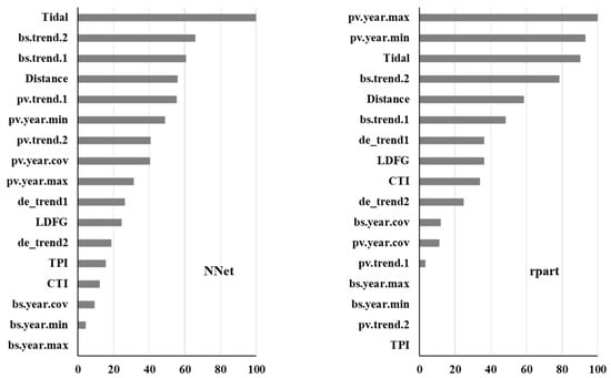 We extracted the contribution of predictor variables to model performance for four classifiers: one boosting tree (xgbtree), one bagging tree (RF), and two individual classifiers (NN and rpart). With the exception of one tree classifier, the contribution of tidal height was far more important than other predictors (Figure 5). Other hydro-geomorphological variables, such as distance to the water’s edge and LDFG, also made a large contribution to the discriminative power of ensemble classifiers. The contribution of predictors derived from Sentinel-2 fractional cover was also substantial, especially for the individual classifiers, which are the top predictor for rpart (Figure 5).