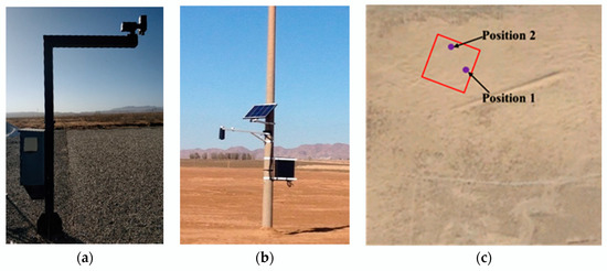 Automatic observation systems of ground reflected radiance in the Baotou site. (a) Observation system on grey target; (b) observation system on sandy site; (c) the positions of the two spectrometers on sandy site.