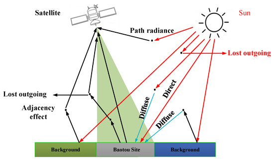 To convert the observed radiance into reflectance, and to propagate reflectance to TOA, atmospheric radiative transfer must be considered. Figure 3 gives a simplified (ignoring multiple scattering) visualization of the relevant light paths. The red lines represent the illumination of the Baotou site. Some light illuminates the Baotou site directly from the sun. A proportion of this is lost through atmospheric scattering on the way to the site. The site is also illuminated by the sky through light that is scattered in the atmosphere onto the site (sky diffuse) and light which has reflected off nearby locations and scattered onto the site (sky scatter). We use the radiative transfer model MODTRAN-5 [12] to estimate both the direct solar irradiance (direct incoming beam minus the lost irradiance) and the sky irradiance (the combination of sky diffuse and sky scatter). When propagating to top of atmosphere we must consider light that reaches the satellite directly, the loss of radiation through scattering on the upward path and light that has scattered into the beam from the sun (without reaching the ground) or from other parts of the ground background. Again, MODTRAN-5 is used for this evaluation. Note that as a default MODTRAN-5 assumes that the surrounding ground has the same reflectance as the area of interest. Where this is not the case (e.g., for the grey site BTCN, which is an artificial target), there is an “adjacency effect” that must be separately considered (see Section 4.6).