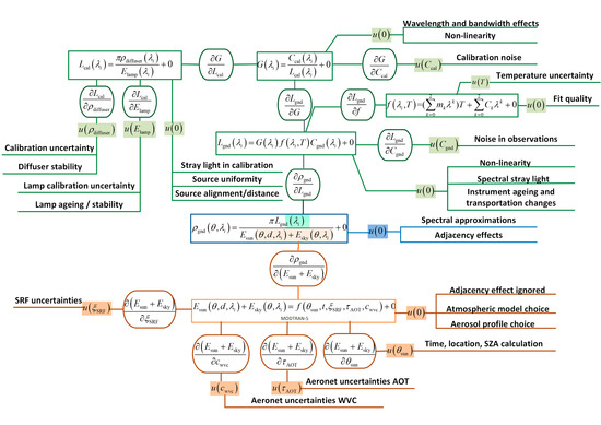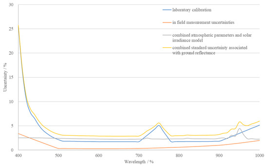 The uncertainty tree diagram for the Baotou measurements of ground spectral reflectance is given in Figure 4, which is reproduced at larger scale in Figure A1 (see Appendix A).