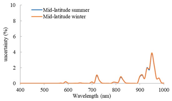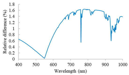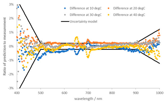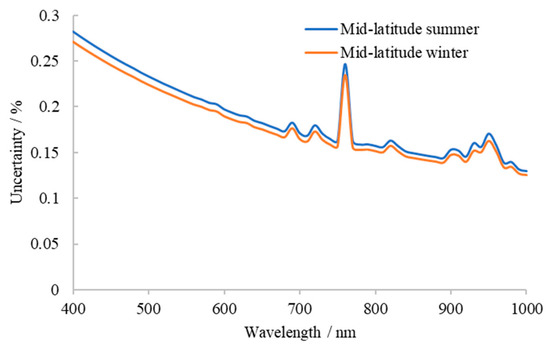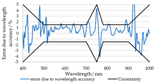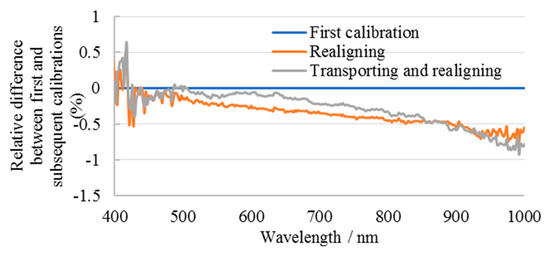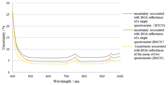 The uncertainty associated with this noise in the calibration signal was estimated from the relative standard deviation of 20 successive measurements of the stable calibration source. The uncertainty associated with spectrometer noise is very close to zero at most of wavelengths, which was estimated to be less than 0.1%.