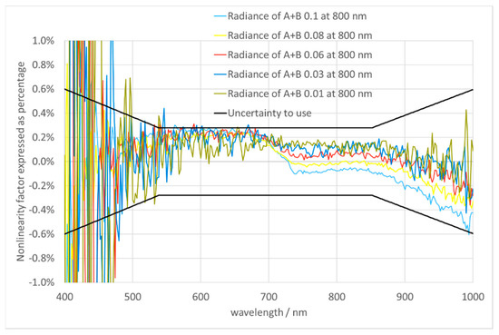 where is the response of the spectrometer for a radiance level where is the source with only lamp A, with only lamp B, or with lamps A and B simultaneously. The results are shown in Figure 6 and show an increase in nonlinearity for the shortest and longest wavelengths. Because nonlinearity is not corrected in the measurements during calibration or in the field, we treat the observed non-linearity as an uncertainty component. At the shortest wavelengths it is difficult to separate nonlinearity from noise, but taking into account that nonlinearity is unlikely to be significantly different from pixel to pixel, an uncertainty curve has been approximated using a local standard deviation. At longer wavelengths there is a noticeable trend, and uncertainty bounds have been drawn to include this trend. From this we assume that the uncertainty associated with nonlinearity is 0.28% from 540 nm to 850 nm, increasing to 0.6% linearly for longer and shorter wavelengths.