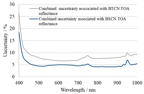 Uncertainty budget for BTCN and BSCN BOA reflectance. The abbreviations FC, PC, and I mean fully correlated, partially correlated, and independent, respectively.