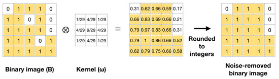 Convolution operation for noise reduction. A binary image (B) is smoothed by the Gaussian kernel (ω). The binary image contains two pixels of 0s (open cells) that are surrounded by 1s (shaded cells) and considered noise. The convolution operation generates a matrix with the two noise cells filled by values above the Gaussian threshold (0.5). The transformed binary image displays the removed noise.