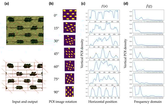 Automatic detection of plot layout through image rotation. The input image has a layout arranged in a rhombus shape (a). The rotation of the POI image is demonstrated at 15-degree intervals (b). Vertical-scan signal f(x) is an average value at the position x of the POI image, where x is the horizontal position of the POI image (c). Frequency domains are computed via Fourier transformation, where is the signal frequency over f(x) (d). is used to determine the optimal rotation of the field image. When the correct rotation matches Fourier transformation, the frequency domain contains a single peak with a high POI density relative to other rotations. This example demonstrates that valid rotations (45° and 90°) have repeating vertical POI density patterns that, when Fourier transformed, result in a frequency domain that can determine the optimal rotation. Red stars shown in the two optimal rotations represent the plot centroids in (c) and the single peaks of frequency domain (d).