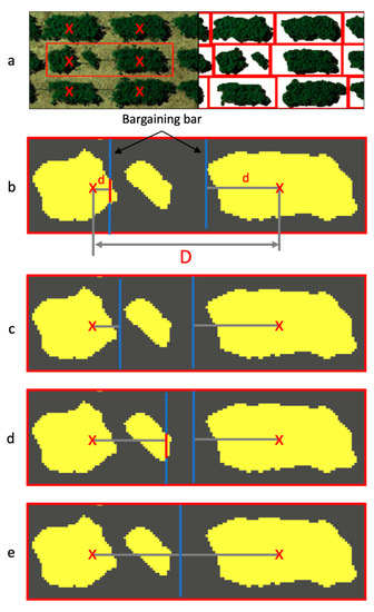 Each agent will bargain with its neighboring agents to expand its territory (Figure 4). The idea “bargaining bar” is introduced in this step. When the agent bargains with its horizontal (or vertical) neighbor, the bargaining bar is initialized as a vertical (or horizontal) vector at its plot center. The length of the vector is plot height (or plot length) estimated from the previous step. Two neighboring bars will iteratively compare their “bargaining power” to decide which one can shift a pixel toward the opposite plot. In the case of a tie, both bars can shift. This bargaining process will end when two bars meet at the same position, which is the position where plot boundaries are finalized. Two factors define the bargaining power. The first factor is the proportion of POI covered by the bargaining bar, defined as V(bar):