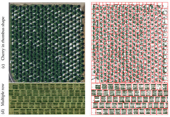 Two satellite images were chosen to demonstrate the tolerance of GRID on low resolution—one image of wheat with zigzag plots (Figure 5b) and one image of cherry trees arranged in a rhombus shape (Figure 5c). The wheat field is located on the Spillman Experimental Farm at Washington State University in Pullman, Washington (WA), U.S.A. Testing germplasms were continuously planted one after another in rows. Rows were separated by empty spaces. The individual plants adjacent to two germplasms were treated with herbicide for removal to ensure that all plots were the same size. Although the resolution was low, GRID clearly separated the plots. The cherry tree orchard is located in Grandview, WA, U.S.A. These trees varied in both shape and size. The image was taken when the sun cast a black shadow from each tree in the direction of the neighboring tree above and to the right. In addition, the soil at the base of the trees was covered with white plastic for weed control. GRID successfully removed both the shade and the background plastic.