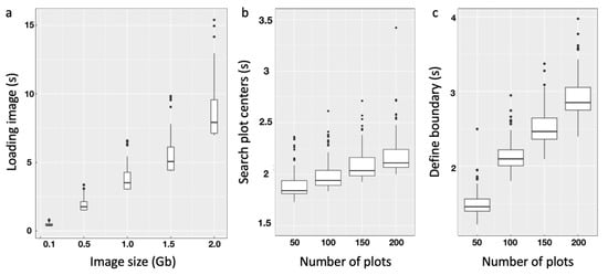 In the step of loading images, we observed a linear relationship between the file size and the median of the elapsed time from 100 iterations (Figure 7). For most cases, files smaller than 1 gigabyte can be loaded within 5 s, and a 2 gigabytes file takes less than 10 s to load in our testing environment. In terms of computing speed stability, which refers to the potential for differences in elapsed time from one iteration to another, loading a larger file may result in a greater variation in elapsed times. In addition, plot number is another factor that can limit computing speed. In the step of plot searching, we found that every extra 50 plots takes another 0.2 s to compute. With 200 plots, only 1 out of 100 iterations may take more than 3 s to finish the search. The boundary bargaining step takes a little more time than plot searching. On average, an image with 200 plots takes 2.8 s to finish the bargaining process, and 4 out of 100 iterations may take more than 3.5 s. Thus, we observed that the computation time for both crucial steps, plot searching and boundary bargaining, also increases linearly with the number of segmented plots.