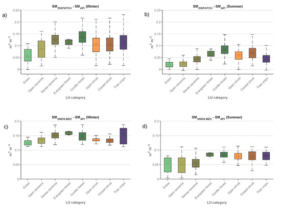 Subsequently, the SM at different land covers was investigated from the analysis of the biases of the two SBSM products (DISPATCH and SMOS-BEC) with respect to the API SM. Figure 3 shows these biases found for the different LU categories for DISPATCH and SMOS-BEC. These results were divided for summer and winter periods, in order to detect SM differences due to the variable state of the vegetation and its influences on the upper layer of the soil.