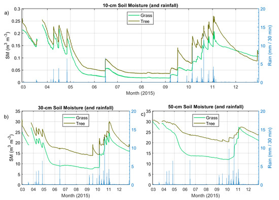 During this period, the SM decrease was dampened at the grass site but not beneath the trees (note the light rainfall and the different SM decrease from mid-November to the end of December in Figure 5a). In fact, the SM at the tree site was not affected by the light rain events. We think that this could be caused by the effect of the interception of the tree canopy, preventing the rain water from reaching the ground level, and thus its infiltration up to the 10-cm depth of the sensor. However, the light-rain effect was observable in the SM measured at the grass site due to the absence of trees (no interception, see the different decrease in Figure 5a in mid-November), finally leading to a higher SM content at the grass than below the trees. While the light-rain effect was observed at 10 cm, it was not observed at 30 and 50 cm (Figure 5b,c).