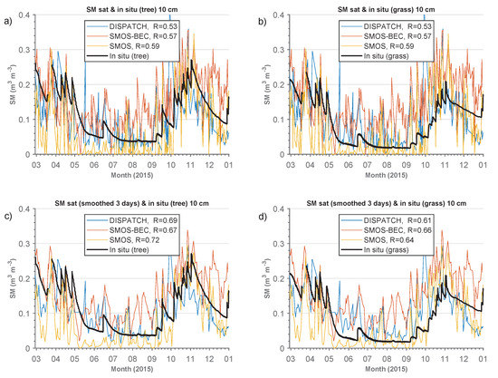 The noise in the SBSM measurements is well observed in these graphics. Consecutive measurements show SM variations that are not real, which is a well-known limitation of the SM measurements from satellite. Indeed, some studies have shown how the information averaged from several consecutive SMOS satellite measurements often offers better results than accepting and using only one measurement at a certain time (see for example [27] or [45], where the results of their application were better using five or six SMOS passages). In this context, the evaluation of the two SBSM products was performed by applying a low-pass Butterworth filter with a cut-off frequency of several days (Figure 6c,d), in this case using 3 days (ideally equivalent to six SMOS measurements approximately). The correlation with the in situ data improved significantly up to values of 0.69, 0.67, and 0.72 for DISPATCH, SMOS-BEC, and SMOS, respectively, in the case of comparison with the measurements taken beneath the tree (Figure 6c), which implies improvements of 16%, 10%, and 13% from the original values.