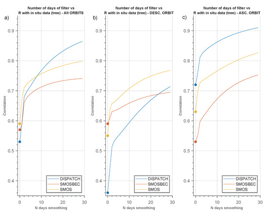 Some of the noise of the SM signal could be related to differences between the ascending and descending retrievals. Therefore, we investigated if the correlation improved when considering a unique type of orbit of SMOS (Figure 7b,c for the descending and ascending orbits, respectively). The results indicated that the DISPATCH evaluation was significantly better when using only the ascending orbit of SMOS (blue line). The same was also observed for SMOS but with less improvement, while the differences between orbits were more difficult to observe for SMOS-BEC.
