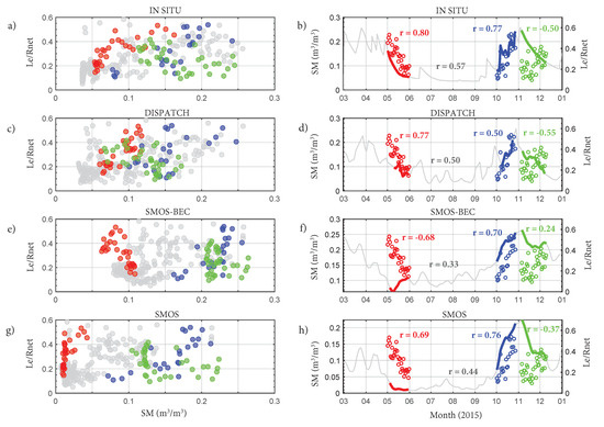 By analysing all the points of the scatter plot in Figure 8a (grey and coloured points), we see a group with low SM, corresponding to the summer period with a dry regime associated with low values of Le/Rnet, while the other points show a linear relationship between both variables, corresponding to seasons with varying SM. This all-year behaviour can be also observed using the satellite products (Figure 8c,e,g), with similar correlation between both variables: 0.57 for the in situ data, and around 0.50, 0.33, and 0.44 for DISPATCH, SMOS-BEC, and SMOS products, respectively. However, the interpretation of this comparison for the whole year is difficult, as different periods with varied particularities are merged. Thus, in semi-arid regions like the savanna, the relationship between these two variables can change significantly from one season to the other, as plants are typically well adapted to long dry periods followed by rainy ones.