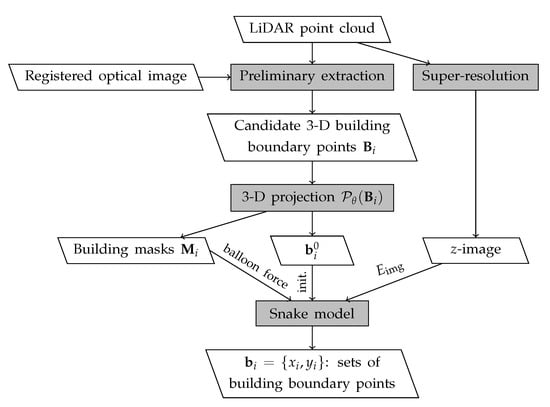 This paper presents a novel unsupervised building extraction method, built around the Super-Resolution-based Snake Model (SRSM). Figure 1 depicts the flowchart of the proposed method. It employs predominantly the LiDAR data, with additional information from the optical image in order to remove vegetation. First, the SRSM is automatically initialized by the preliminary candidate building boundaries extracted from the LiDAR point cloud. This extraction process is carried out as presented in [39]. It relies on an elevation thresholding, a proximity regrouping, and a convex hull detection. The ground elevation value is determined by a DTM, generated using the method proposed by [44]. This process is also similar to other research works such as [25,45]. Since LiDAR-based building extraction can be difficult due to nearby vegetation [46], this process also involves a vegetation removal based on the Normalized Difference Vegetation Index (NDVI) derived from an optical image. As the two data sources are used jointly, a registration is necessary in order to avoid misalignment problems. This registration can be carried out a priori (i.e., data acquisition using the same platform) or a posteriori [47,48]. It aims to estimate the transformation model, allowing reducing the misalignment between the two datasets. The 3-D building boundary points extracted from the LiDAR point cloud are denoted by , where i represents the building index. The registration results in a set of transformation model parameters , which is then used for the projection of the 3-D building boundary points onto the image space, denoted by . Then, they are used as initial points (denoted by ) for the snake model, as well as to generate the building masks (denoted by ) used in the balloon force. The SRSM operates on high-resolution LiDAR-based z-images generated by a super-resolution process. It also involves an improved balloon force model based on the building masks . The resulting building boundary is denoted by .
