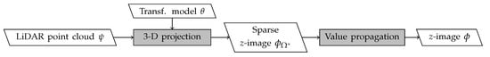 where is the 3-D projection associated with the transformation model parameters . The x- and y-coordinates of the LiDAR 3-D points are used to locate the pixels in the z-image associated with such points. Next, the projected values indexed by will be propagated to their neighboring pixels (which are indexed by ).