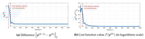 The minimization of the cost function described in Equation (11) is carried out using the Fast Iterative Shrinkage-Thresholding algorithm (FISTA) [53]. Its computational efficiency is adequate for solving large-scale problems, with a convergence rate of , where k is the iteration counter. FISTA is significantly faster than standard gradient-based methods such as Iterative Shrinkage-Thresholding algorithms (ISTA). Full details on the implementation of the proposed SR process can be found in [48].