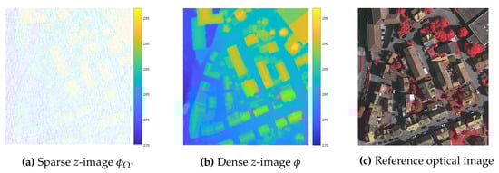 The convergence rate of the SR is illustrated in Figure 3. Figure 3a depicts the differences between the estimated z-images at consecutive iterations, i.e., . The cost values through iterations are shown in Figure 3b. One can observe that the z-image has nearly converged into a stable solution after approximately four hundred iterations. Figure 4 shows the outcomes of the projection and the propagation of altitude values from the LiDAR data onto the optical image space. The value projection outcome is depicted by the sparse z-image (Figure 4a), whereas the value propagation outcome is shown by the dense z-image (Figure 4b). The pixel color of the sparse and dense z-images represents the surface elevation in meters. Figure 4c shows the reference optical image on the same urban scene, in order to assess visually the quality of the super-resolved z-image. It can be noted that the elevation of buildings and other objects (e.g., trees, cars, etc.) are well presented on the dense z-image (Figure 4b) and correspond to the information in the optical image. The proposed SR process is shown to achieve the purpose of augmenting the spatial resolution of the LiDAR point cloud. An assessment of the SR performance will be presented in Section 3.3.