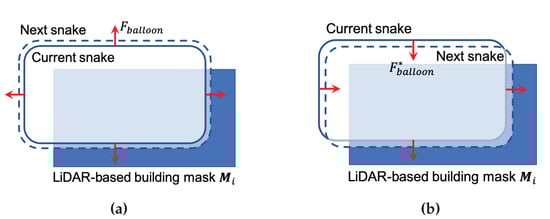Figure 6 depicts a schematic representation illustrating the proposed adaptation. It demonstrates how the snake behaves differently (i.e., either inflating or shrinking) based on its relation with the given LiDAR-based building mask. With the LiDAR-based building masks represented by the blue rectangle, the balloon force behavior (represented by the red arrows) is improved to shrink or inflate at different snake points.