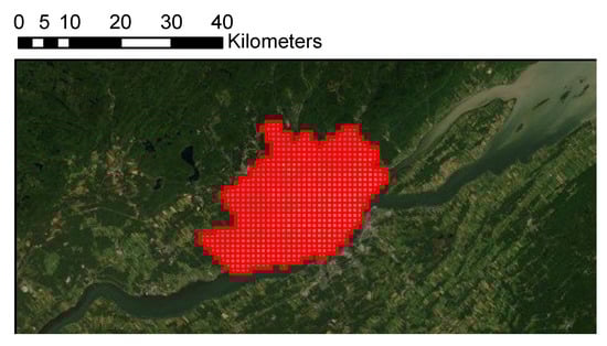 Besides the assessments on the Vaihingen dataset representing a European urban context, we additionally conduct a performance assessment in another geographic context, namely North America. In this regard, the method is carried out on the urban areas of Quebec City, QC, Canada. They cover a total area of 656 square kilometers. The whole area is divided into tiles of 1 km × 1 km, as shown in Figure 7, for the sake of processing time and memory constraints. The involved LiDAR and optical imagery datasets are described in column four and five of Table 1. The ground truth boundaries of buildings in the whole test area are provided and updated monthly by the City of Quebec, named Empreintes des bâtiments [56]. The ground truth dataset used in this work was downloaded on 4 March 2019.