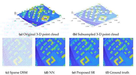 Besides the visual assessment provided in Section 2.2.1, the performance of the proposed SR process is also quantitatively evaluated. We compare it with other conventional 2-D interpolation methods, namely nearest neighbor (NN), bilinear, and natural interpolation [59]. This evaluation and comparison are depicted by Figure 8. The four methods are examined on a real LiDAR point cloud with an average density of 3.8 points/m2 (Figure 8a). Such point cloud is then subsampled by a chosen factor, namely 2, 4, and 8, yielding a subsampled point cloud which serves as an input for these SR/interpolation methods. These experimented factors are chosen based on the proportion between the respective spatial resolution of the datasets (cf. Table 1). For example, Figure 8b depicts the 3-D point cloud subsampled by a factor of 2. Based on the sparse DSM generated from this subsampled point cloud (Figure 8c), each interpolation method generates a DSM having the spatial resolution equal to that of the subsampled LiDAR point cloud times the upscaling factor—in other words, equivalent to the spatial resolution of the original point cloud. The resulting interpolated DSM provided by each method (e.g., Figure 8d,e) is compared with the DSM generated from the full-resolution LiDAR point cloud, which is considered as the ground truth for the assessment (Figure 8f).