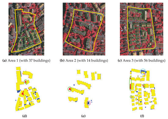 For the per-object evaluation, an extracted building is counted as a TP if at least 50% of its area coincides with its ground truth. On the other hand, a FP is an extracted building without a corresponding building in the ground truth or if the coincided area with the ground truth is less than 50%. Whereas a FN means the proposed approach fails to extract a building existing in the ground truth. The corresponding metrics are then computed using Equation (14).