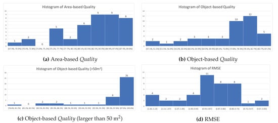 The geometrical accuracy of the method can also be evaluated by measuring the root-mean-square error (RMSE) of distances from extracted building outlines to the reference outlines, without considering points with distance greater than three meters. Such a threshold is defined by the assessment methodology [26]. A smaller distance indicates a better geometrical accuracy.